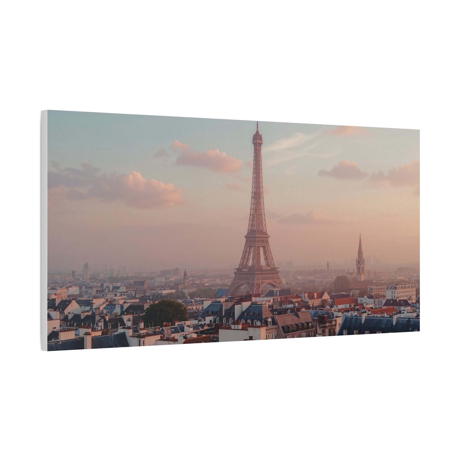 Soft, matte canvas stretched over a 1.25" pine frame, this print captures a hazy Paris skyline with the Eiffel Tower bathed in warm, early-evening light. The muted pastels and gentle contrast create a calm, nostalgic mood, like standing on a rooftop as the city exhales at sunset. Lightweight but sturdy, the stretched canvas arrives ready to hang and brings quiet European charm to living rooms, bedrooms, or office walls. Subtle texture from the cotton-poly canvas gives depth to the image without glare, keeping the focus on the delicate tones and architectural silhouette.