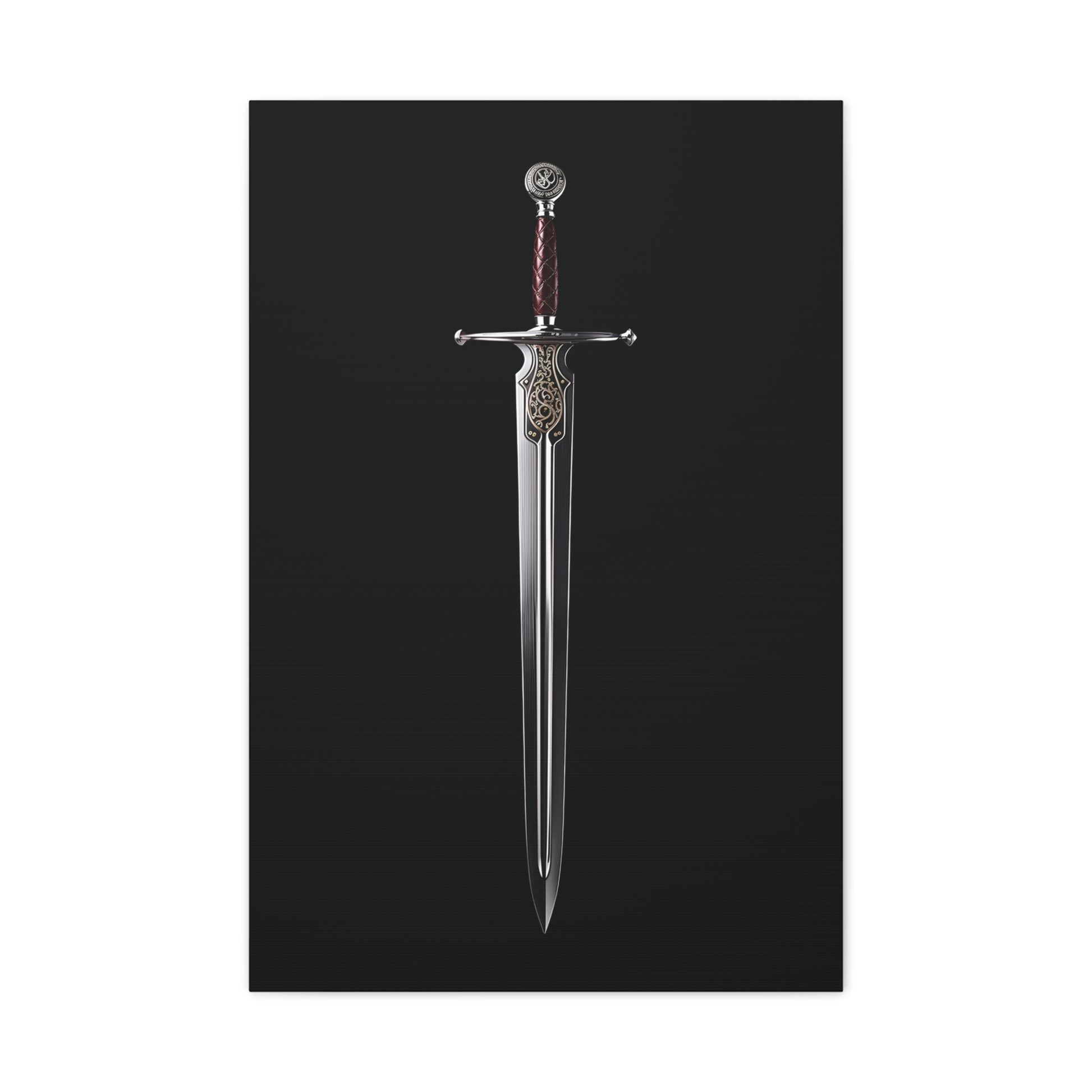A striking matte canvas print featuring a single, elegantly detailed medieval-style sword set against a deep black background. The long, centered composition draws the eye along the blade’s mirrored surface to an ornate guard and textured leather-wrapped hilt. Printed with UL-certified Greenguard Gold latex inks on a cotton-poly canvas and stretched over sustainably sourced radiata pine, this piece brings a quiet, solemn energy to any wall. The minimalist backdrop lets the craftsmanship of the sword speak. a tasteful, atmospheric addition for collectors, history buffs, or anyone who loves heroic, moody decor. Back hanging hardware is included and soft rubber dots protect the wall and keep the canvas steady when displayed.